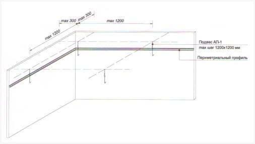 - В случае если между плитой перекрытия и подвесным потолком планируется размещать какие-то дополнительные элементы, то это направляться учитывать на этапе разметки и заблаговременно закладывать это в отступ от верхнего края стенки, в случае если же пространство остается пустым, то минимальная величина зазора предположительно составит 5 см.
