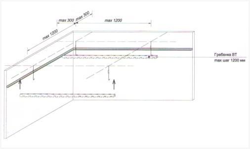 - Следующее, что необходимо сделать – это вычислить длину гребенок и их количество. Стоит учесть, что направляющая обязана размешаться от стенки не потом чем на 30-40 см, а между стрингерами расстояние не должно быть больше 120-150 см (лучше сделать меньшее расстояние, тогда конструкция будет более твёрдой).