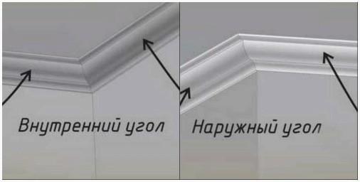 Стыковка потолочного плинтуса в углах возможно образована 2 видами углов – внутренними углами между стенками и внешними. Внутренние углы имеются в любой комнате, и их величина неизменно меньше 180 градусов, — в большинстве случаев, 90. Внешние углы возможно заметить пара реже. Они в большинстве случаев имеют величину больше 180 градусов – как правило 270. Любой угловой стык будет складываться из двух плинтусных планок – правой и левой. Зависимо от того, какой угол карниза обустраивается, планки подрезаются по-различному.