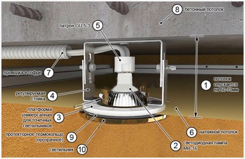 Естественно, натяжной потолок не может выдерживать таковой груз, как осветительные устройства, ввиду этого предварительным этапом при монтаже точечных светильников выступает установка закладных элементов и особых регулируемых стоек, за счет которых и осуществляется фиксация устройств. Стойка складывается из 2 направляющих и особого кольца, которое имеет внутренний диаметр, что соответствует посадочному диаметру точечного светильника. Направляющие снабжают возможность регулировки аналогичного кольца по высоте.