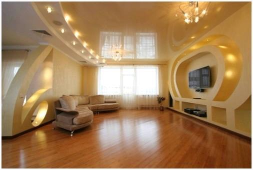 В случае если для вас гостиная – это место, где вы проводите негромкие спокойные вечера с семьей, смотрите телевизор либо читаете любимую книгу, то свой выбор направляться остановить на сатиновых либо матовых натяжных потолках. В случае если же в гостиной вы довольно часто встречаете гостей, устраиваете разнообразные вечеринки, то в обязательном порядке необходимо выбрать глянцевый потолок, он создаст дополнительную нотку праздника.