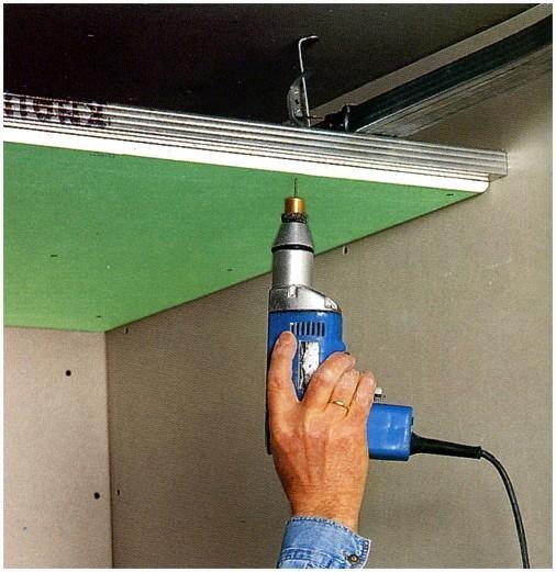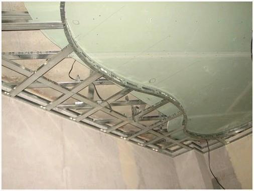 Готовый каркас обшить страницами гипсокартона, фиксируя полотно саморезами. Базовый, верхний уровень потолка готов.