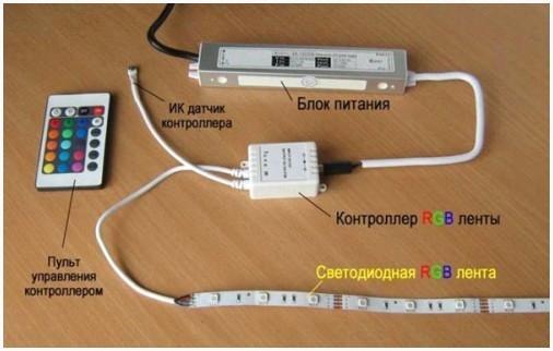 - Подключая многоцветную (RGB) ленту, нужно выполнять полярность: светло синий и тёмный провода – минус, красный – плюс;