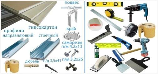 - Элементы для фиксации (дюбеля для крепления каркаса к потолку, саморезы для гипсокартона и профиля);