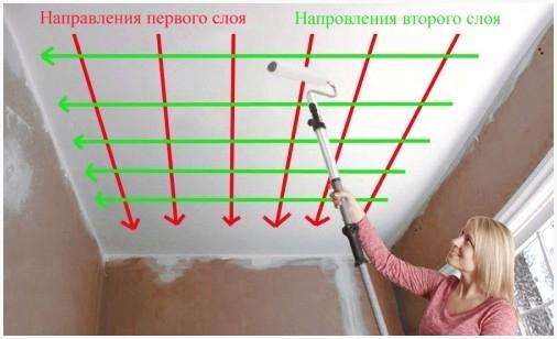 При работе не отрывайте валик от поверхности, увеличивая по мере расходования краски силу нажима. Следы от краев валика необходимо раскатывать в перпендикулярном направлении. Если вы планируете красить потолок водоэмульсионной краской в пара слоев, то не забывайте, что последний слой должен размещаться в направлении окон, а прошлый – в перпендикулярном направлении.