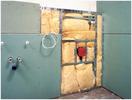 - В полость каркаса возможно уложить тепловую и шумовую изоляцию. При необходимости – провести электропроводку, которую в обязательном порядке нужно поместить в гофрированную трубу, либо проложить водопроводные трубы.