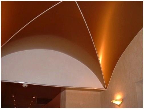 - Арка – таковой метод предполагает плавные переходы от стенку к потолку, создается эффект закругленности. Радиус возможно фактически любым, как того требует дизайнерский проект. Помимо этого, довольно часто используют конструкции, где гармонично сочетается пара арок, различной высоты и радиуса. В случаях, в то время, когда используются глянцевые полотна с зеркальным эффектом, получается визуально увеличить пространство и расширить его высоту. Установленные по периметру помещения арки образуют подобие купола.