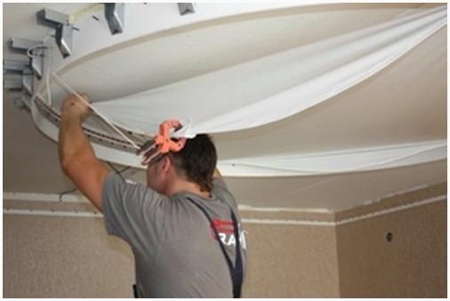 - В случае если в доме случится непредвиденная обстановка и потолок будет затоплен, то достаточно мастера, который бережно высвободит один угол полотна и сольет жидкость, а после этого снова вернет потолок в обычное состояние.
