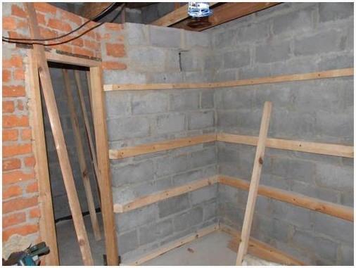 Для стен с неровной поверхностью бруски берутся большего сечения. Крепятся они при помощи болтов, нагелей либо винтов. На протяжении установки каркаса, на неровных стенках, нужно пользоваться отвесом и уровнем, каковые окажут помощь отследить его вертикаль и горизонталь. При необходимости употребляются узкие деревянные клинья, каковые снабжают нахождение всех брусков в одной плоскости.
