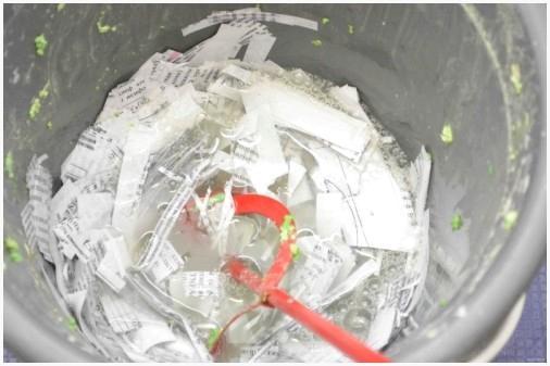 - Первый этап – подготовка целлюлозной базы. Для этого подготовленные листы бумаги нарезаем на кусочки размером до 10 см, другую макулатуру – на узкие полосы длиной 1-3 см. Нарезанную бумагу поместите в пластиковую емкость и залейте горячей водой, нагретой до 30-40 градусов, из расчета 1: 5;