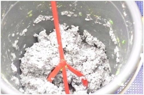 - Время от времени для увеличения прочности состава в него додают гипс (значительно чаще его применяют в том случае, если смесь изготовлена на базе ПВА). Но, в виду его фактически моментального застывания, его додают перед нанесением на стену. Количество гипсового порошка зависит от количества бумаги и берется из расчета 1:1.