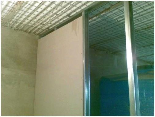 - Каркас стенки. Выполняется из железных профилей либо деревянные рейки. В последнее время, все чаще предпочтение отдается железному каркасу – он считается более крепким, доступным по цене и менее чувствительным к внешним факторам (влажность, механические действия). Железный профиль выпускается намерено под гипсокартон.