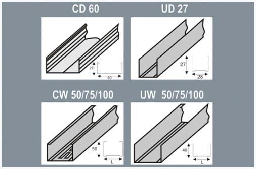 Направляющий профиль (UD, UW) – П-образной формы с гладкими стенками, опорный профиль (CD, CW) – также имеет П-образную форму, его стены – ребристые.
