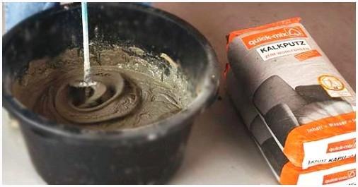 - Смешать сухую цементно-песчаную смесь с кашицеобразным раствором извести.