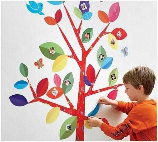 Эстетичное оформление детской комнаты развивает воображение и творческий потенциал ребенка. Украшение стенки вместе с детьми может покинуть неизгладимое впечатление в их памяти. Несложно нарисовать на стене деревце либо вырезать его из цветной бумаги либо самоклейки. А вместо листиков и цветов применяют обрисованные детские ладошки, приложенные к цветной бумаге.