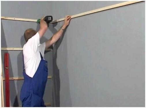 - Первоначально устанавливается верхняя направляющая под потолок, которая выравнивается при помощи лазерного нивелира либо строительного уровня. Крепить профиль возможно при помощи саморезов или дюбелями. В одной с ней плоскости устанавливается нижняя направляющая. Направление планок должно быть перпендикулярно устанавливаемым панелям.