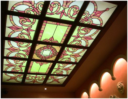 Витражный потолок способен создать незабываемую атмосферу. Высокохудожественный рисунок либо композиция в сочетании с грамотно подобранной подсветкой окажет помощь преобразить помещение и создать чувство сказки.