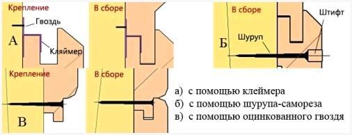 - В случае если монтаж осуществляется посредством клеймеров, крепежные захваты вставляют в паз прошлой доски и при помощи саморезов либо гвоздей крепятся к обрешетке;