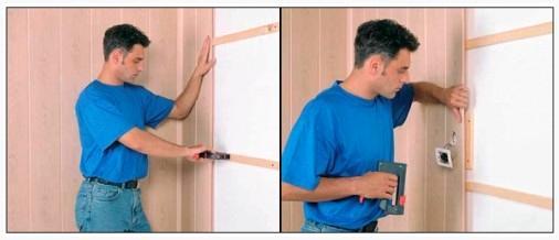- Применяя строительный уровень, приложите брусок к стенке строго вертикально либо горизонтально в зависимости от размещения ламелей и отметьте места сверления;