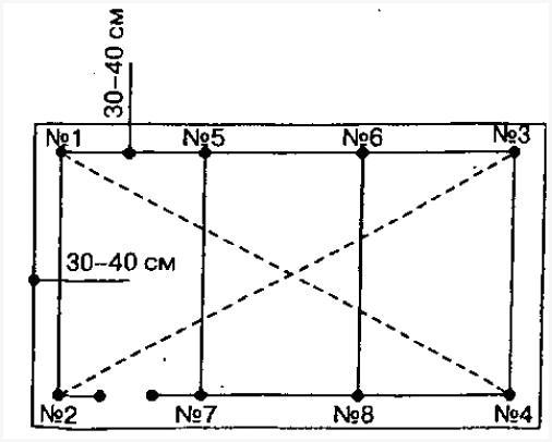 - Отображение горизонтальной разметки. От уровня пола отойти 15-18 см и начертить линию, перпендикулярную вертикальным разметкам. В точках пересечения подготовить отверстия, забить дюбеля, вставить саморезы. Протянуть шнур через установленные дюбеля. От взятой разметки отмерять 245 см (при высоте потолков 2 м 75 см), просверлить отверстия и забить дюбеля.